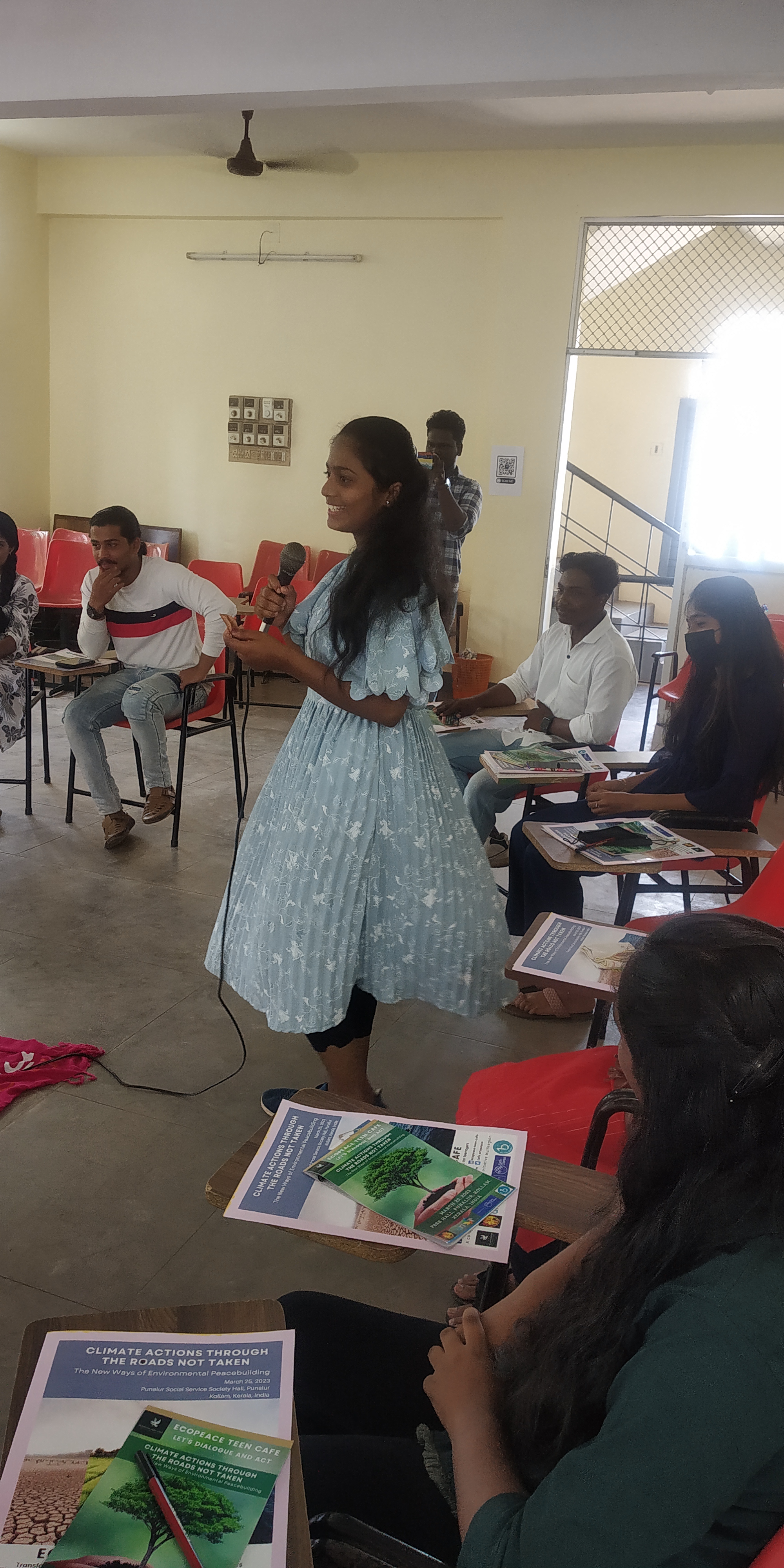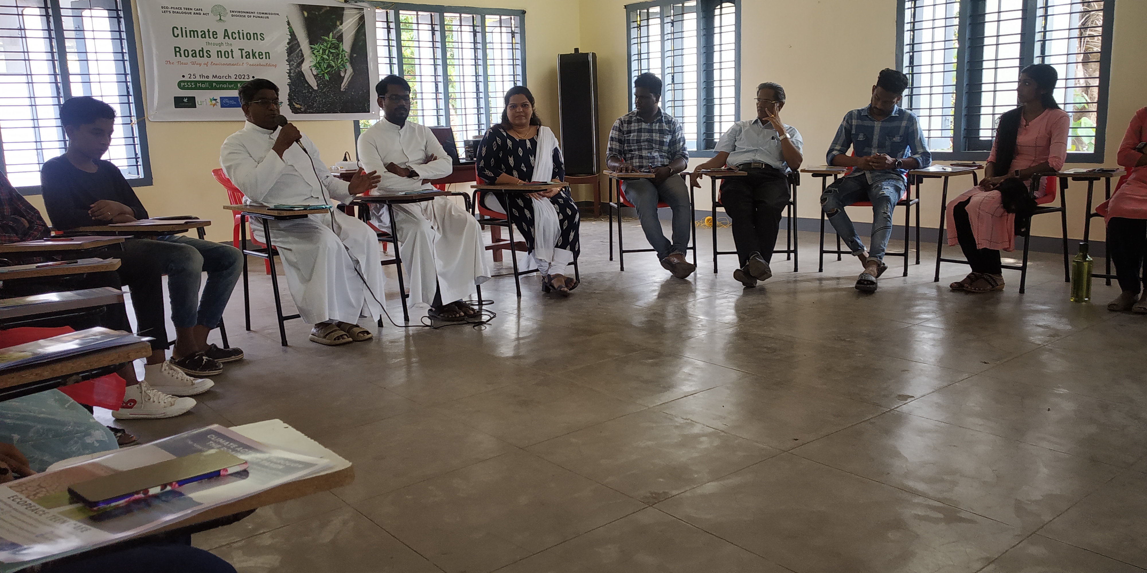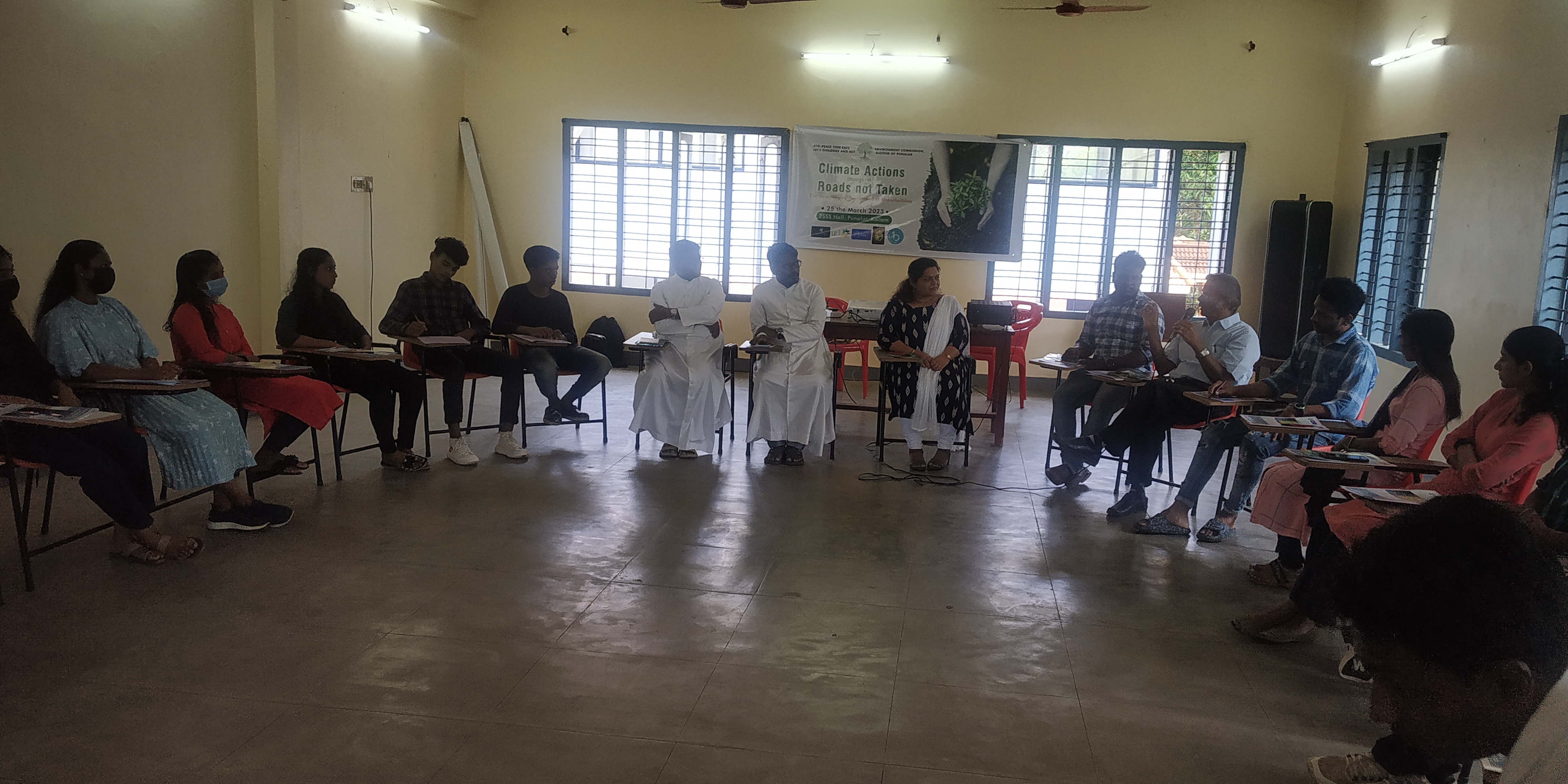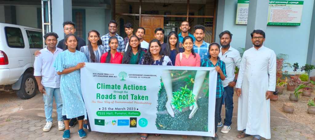 Ecopeace Teen Cafe organised a one-day training programme on climate action titled “Climate Action Through the Roads Not Taken: The New Way of Environmental Peacebuilding” on March 25, 2023, at Punalur Social Service Society Hall, Punalur, Kollam. Ms Greshma P. Raju, the founder of Ecopeace Teen Cafe, facilitated the training programme. The inaugural dialogue was presided over by Fr. Vineeth Benedict L, the Director of the Environment Commission of the Diocese of Punalur. Rev Fr Dr Johnson Joseph, Director of Punalur Social Service Society offered a message on environmental conservation during the dialogue. Dr Abraham Karickam, URI Asia Region Secretary General, offered the keynote speech, and he encouraged participants to take