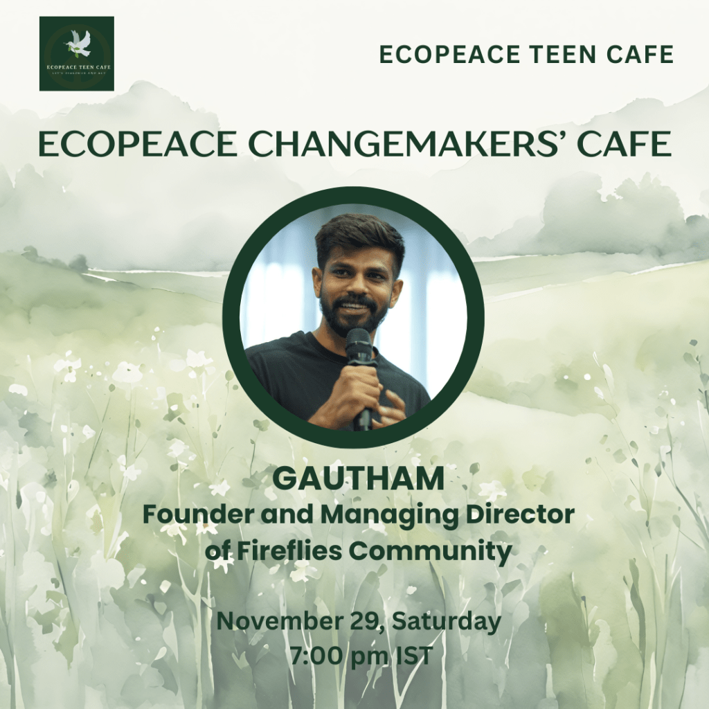 Ecopeace Changemakers Café is a vibrant space where young changemakers come together to share the stories behind their passion—how they dared to turn the impossible into the possible and used their efforts to create positive change for all. Each session becomes a warm, café-style conversation that celebrates their journeys, struggles, and breakthroughs, honouring the courage it takes to follow a purpose-driven path. It also serves as a meaningful moment of connection, where other young people can listen, learn, and feel inspired to begin or deepen their own changemaking journeys.
